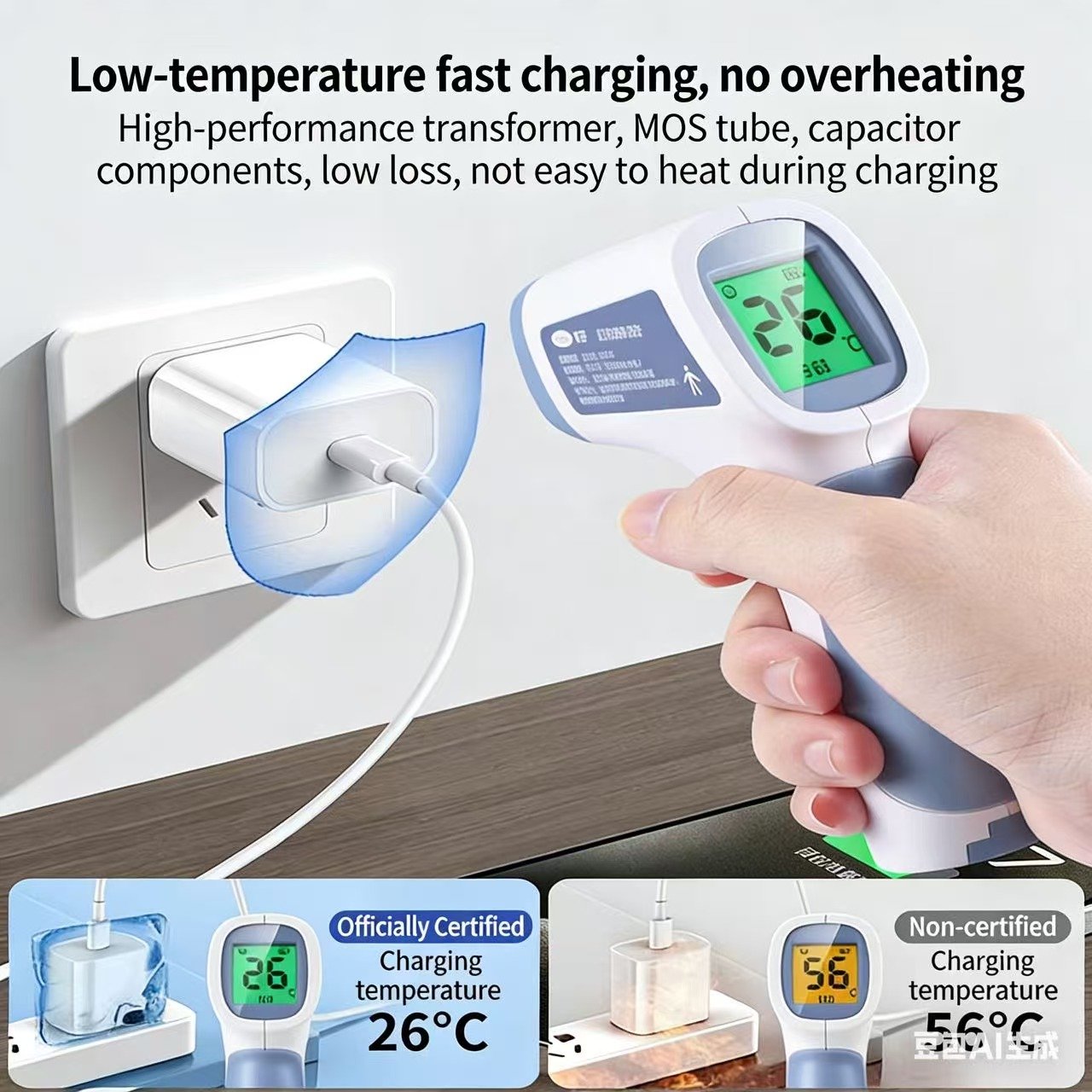 • Official Certification: Officially certified for safe operation, maintaining a charging temperature of just 26°C during use, in contrast to non-certified adapters that can reach up to 56°C, posing overheating risks.